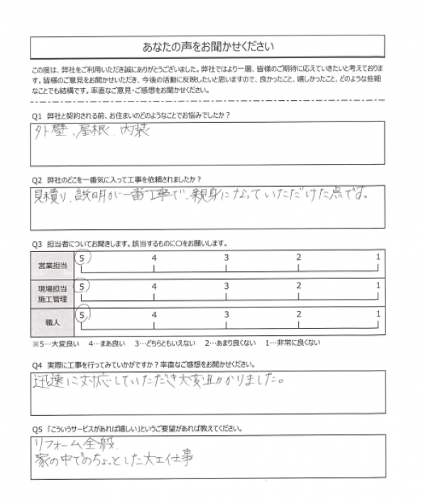 アンケートご回答ありがとうございました。あらいホームは内装も外装もお家の事なら何でもお任せですよ!無料点検に伺った際に詳しくお話をお聞かせください。これからも長いお付き合いになりますので宜しくお願いいたします。